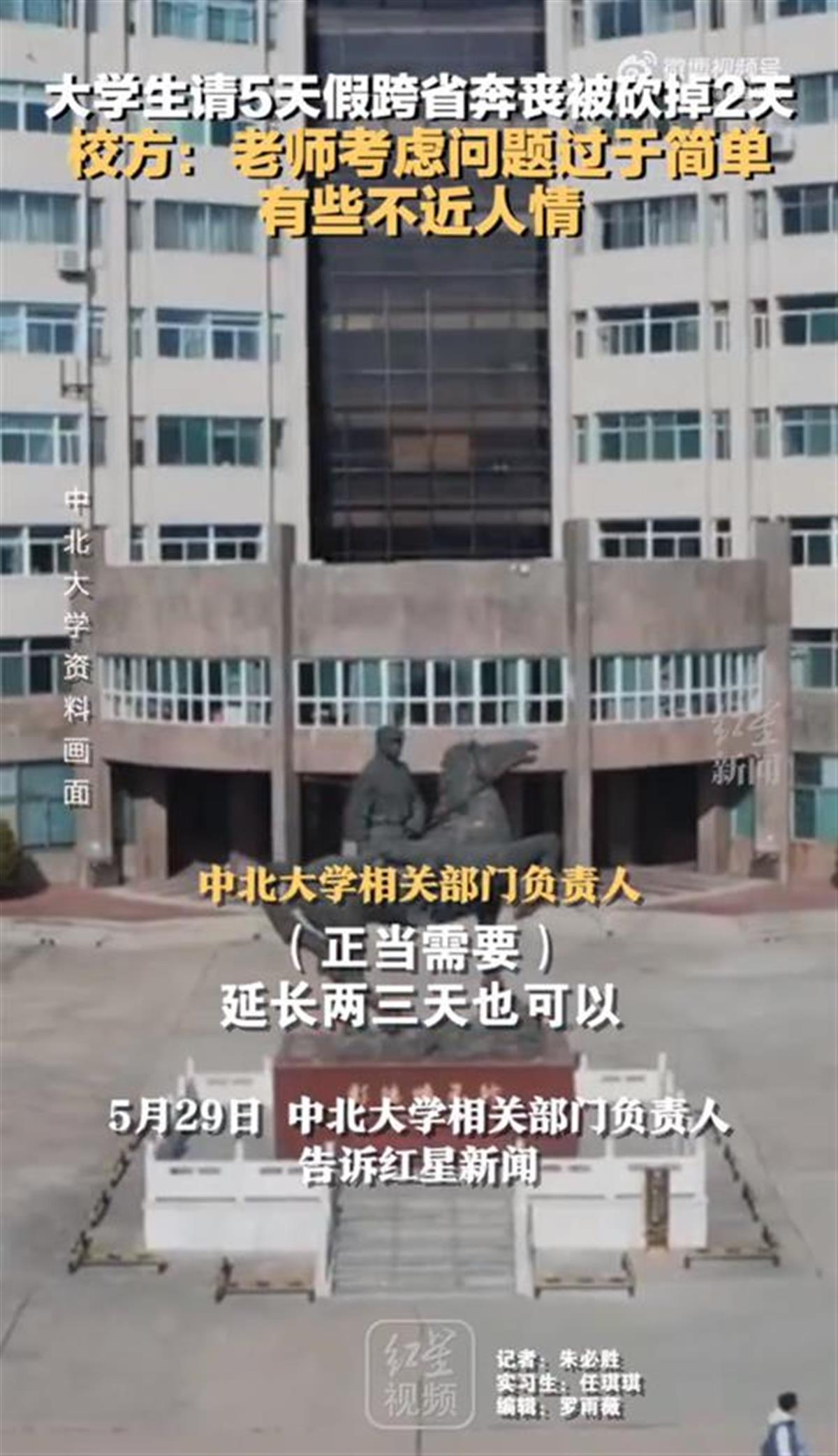 据红星新闻报道:5月27日,山西太原。中北大学的一位学生因奶奶去世,向学院请假回家奔丧,“预计在家待五天”,班主任、教学科均同意申请,但最终却遭学院老师李某某拒绝申请,称“最多三天”。
