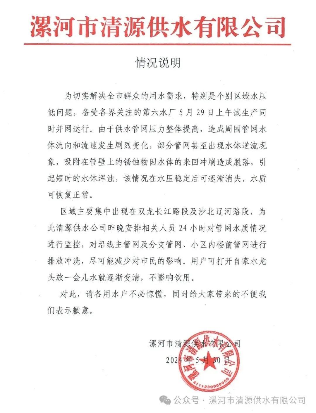 针对这一情况,漯河市清源供水有限公司发布了情况说明: