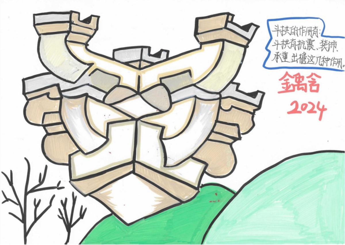 最后,在老师的指导下,我们亲自动手体验了斗拱搭建。大家每四人一组,齐心协力完成了搭建任务。