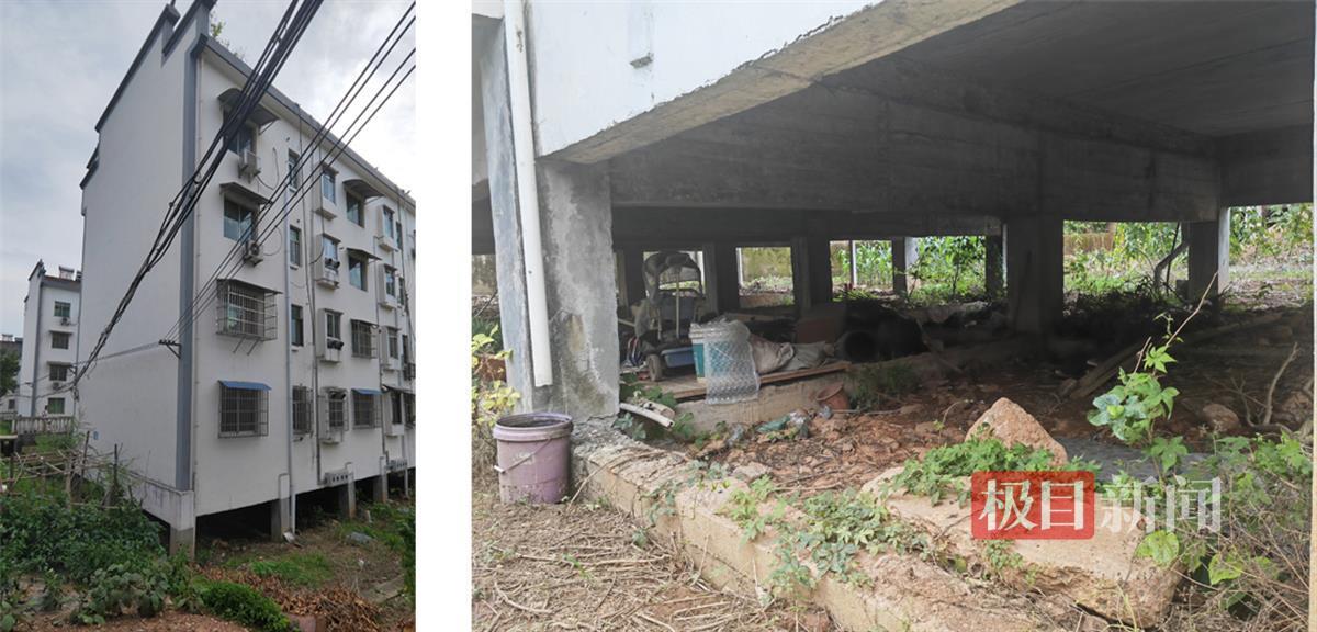 极目新闻记者在现场看到,小区59栋的下面就是三排水泥柱子架起的架空层,59栋南侧那三栋也均是这样的架空层,而且有架空层的楼房还不止这四栋。居民们介绍,这片低洼地带的房屋由几名不同的“项目经理”开发,隔几栋楼便会出现不同的“项目经理”,当初购房也是拿现金交付给这些人。这些人并未在建造时完全填平凹陷,而是在底部设计了架空层,使得房子看起来仿佛“站”在坑里。