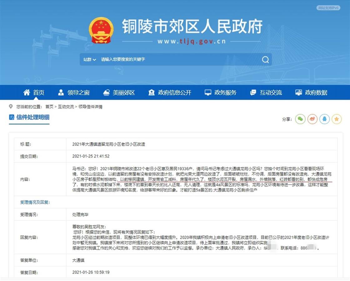 遇难者吴胜龙2021年在郊区人民政府网反映房屋质量问题(网页截图)