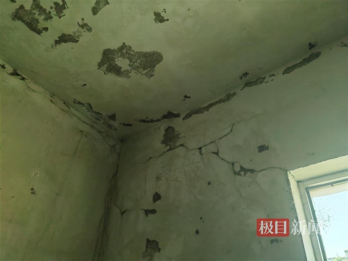 极目新闻记者在龙苑小区内走访发现,不少居民的天花板上都有明显的裂纹和水渍。龙苑小区58栋是一排三层的临街楼房,居民陶阿婆带记者看了她家三楼的情况,墙面和天花板有大片的水渍,墙皮在雨水的长期浸泡下也大片脱落和开裂。陶阿婆说,这还是她花了2000元找人做了两次防水之后的效果,以前是屋外下大雨屋内下小雨,雨水一直顺着楼梯往下流。