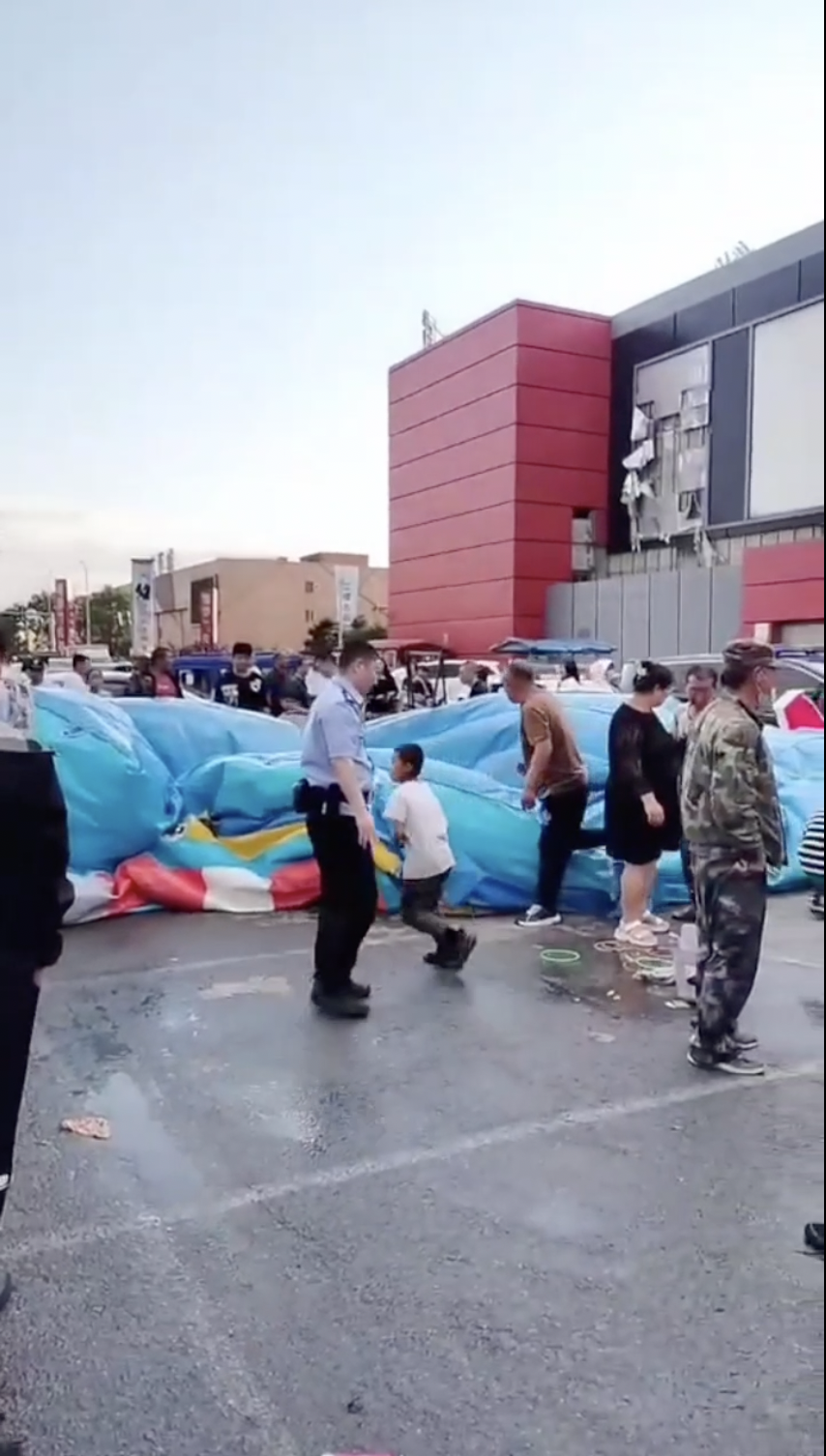 近日,有网友称,辽宁省辽阳市灯塔市佟二堡镇一处充气城堡被风吹起,发生事故。网友发布的多则视频中,在一皮革城附近,有一蓝色充气城堡倒在地面,不少市民围在一旁,民警也在现场处置。