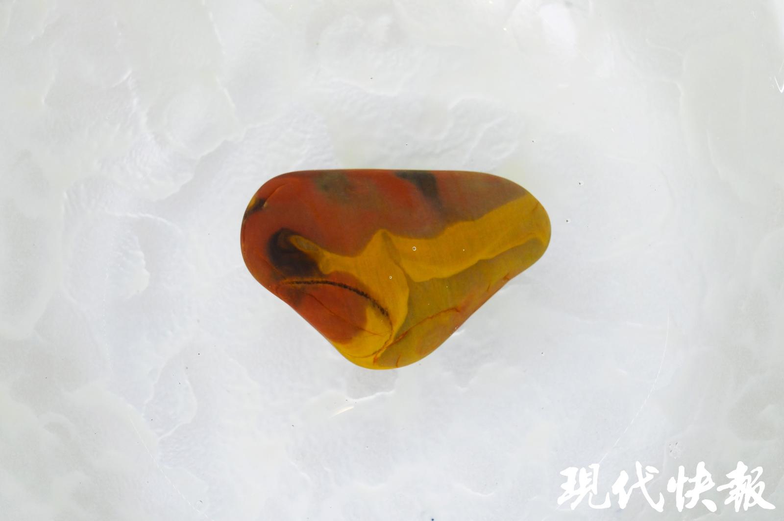 展出的数百枚雨花石都是清石斋主人、收藏家耿先生的藏品,30多年来他一直热衷藏石。“石中皇后”是耿先生最为得意的藏品之一,这块雨花石的形态,既似“楼兰美女”,又如“贵妃醉酒”,其独特的美态和寓意成为全场焦点。还有一块红色雨花石,纹路犹如墨染黑梅,色彩鲜艳、图案灵动飘逸,引得众多观众在此拍照打卡,直呼“难得一见”。