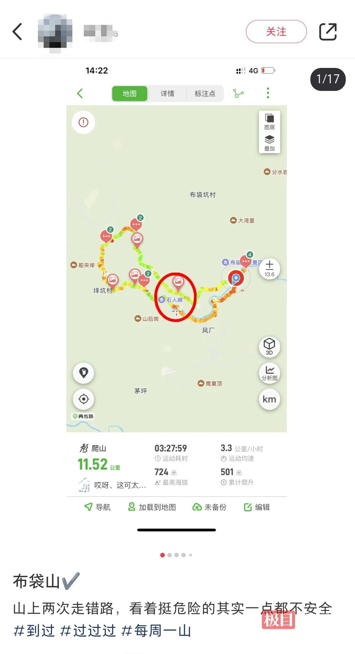 网友发布的徒步路线,途经石人峡事发地点(图源:小红书)