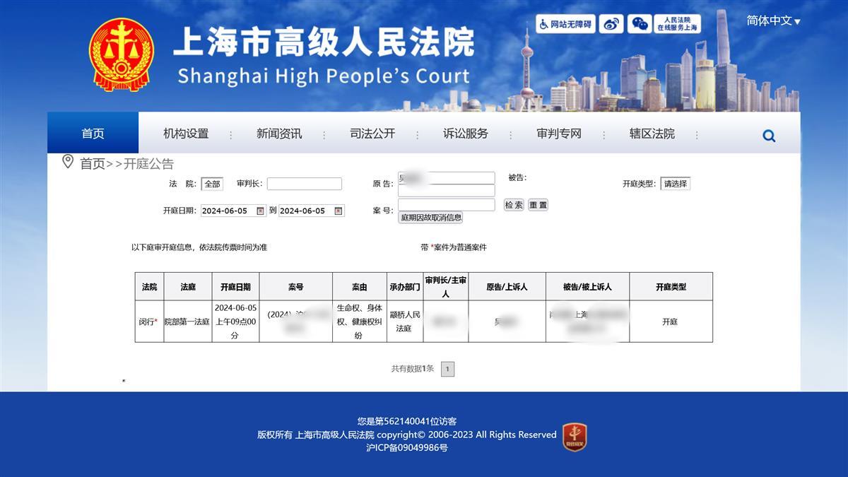 6月4日,上海市高级人民法院网站的庭审开庭信息显示,本案将于6月5日上午9时在闵行区人民法院开庭审理。