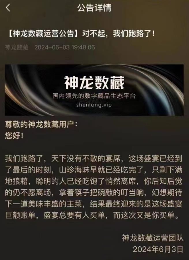 “对不起,我们跑路了!盛宴总有人要买单,而这次买单的是你……”近日,一则数字藏品平台“神龙数藏”公告跑路的传闻在网络传播。公开资料显示,神龙数藏是数字藏品平台,实体公司为北京乐拍网络科技有限公司,主营数字内容制作服务及收藏品鉴定评估服务等。