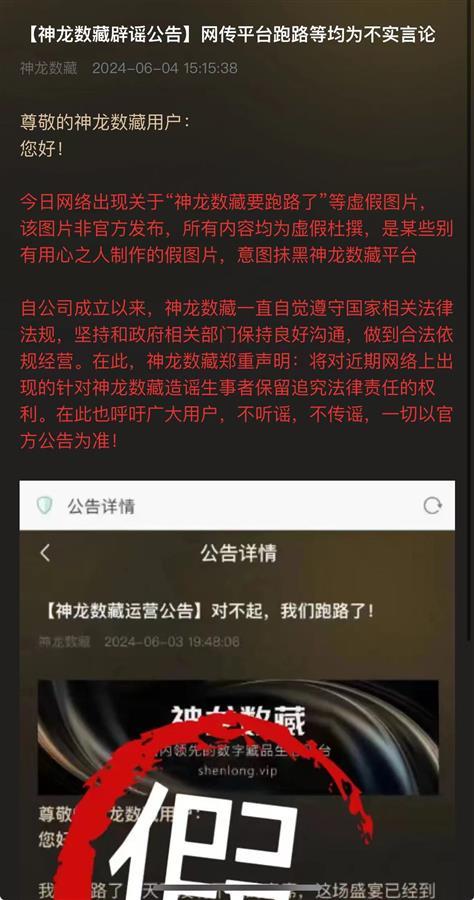 4日下午,神龙数藏在其官方App上发布多条公告回应称“平台跑路均为不实信息”。这则公告称,网传的“跑路”公告非官方发布,所有内容均为虚假杜撰,是某些别有用心之人制作的假图片,意图抹黑神龙数藏平台,将对造谣生事者保留追究法律责任的权利。