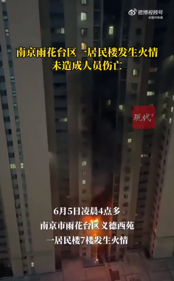 6月5日4时40分许,雨花台区西柿路10号义德西苑1幢706室居民家失火。5时04分明火被扑灭,无人员伤亡。经初步勘察,事故起火点为706室北侧次卧室外部空调平台,具体原因正在调查之中。