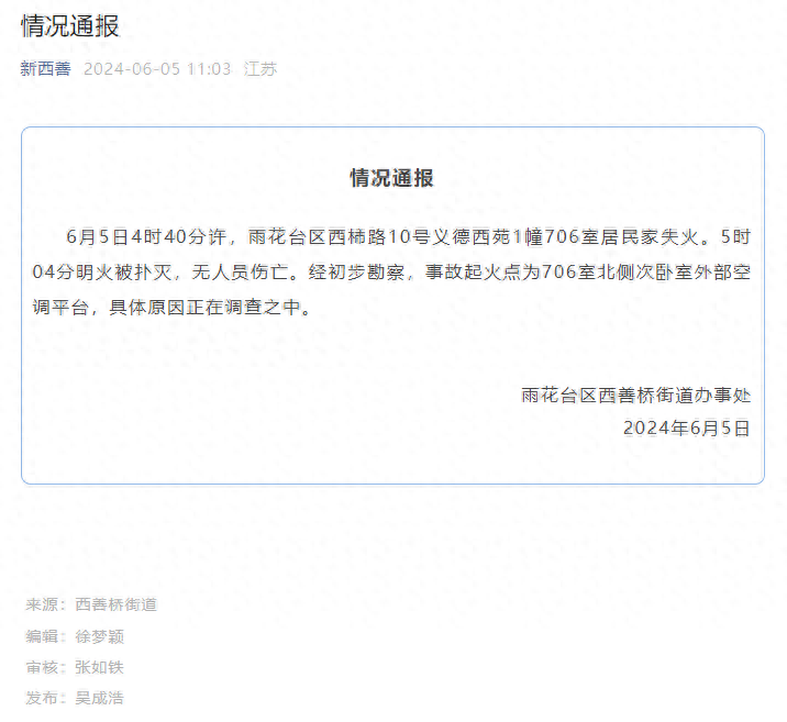 6月5日上午,南京市雨花台区西善桥街道办事处发布情况通报: