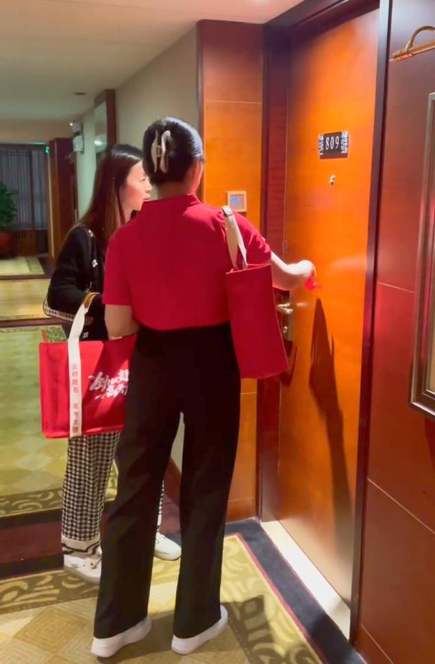 在酒店的8楼到15楼都有学生的房间,王赟和同事一间间查过后,很快又开始了第二轮查寝。这一次,她们不再直接敲门,而是在房间门口听一下,如果里面很安静,学生已经在入睡,她们就不会再敲门了。