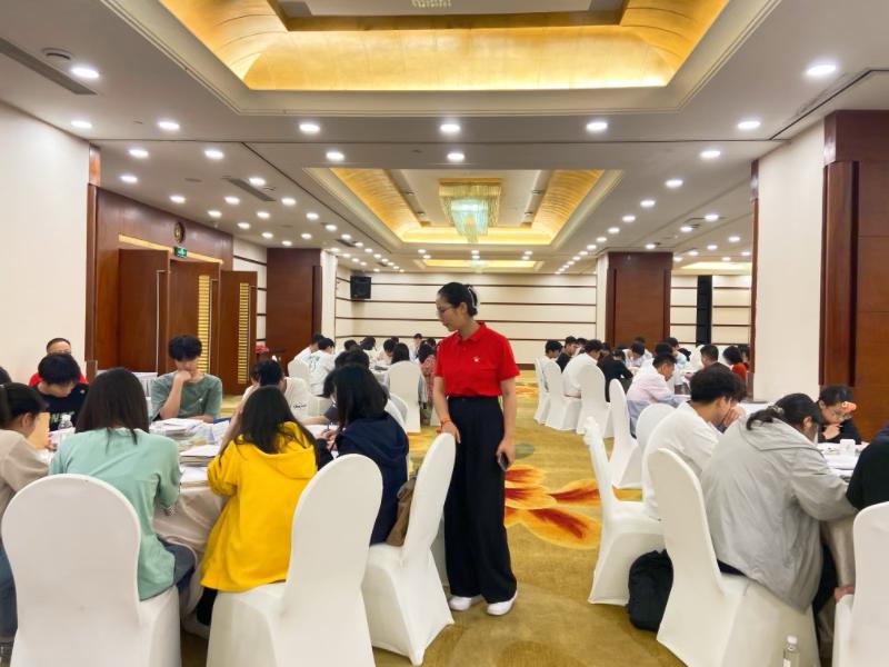 王赟是长沙市同升湖高级中学高复级部主任,也是思想政治老师。6月6日一早,王赟与其他老师一起,身穿红T恤参加了学校的“送考节”。下午又马不停蹄地带学生去高考考场“踩点”,然后回酒店办理入住、吃晚饭。晚饭后7点时分,住酒店的200多名考生在一间大会议里,像往常一样开始了自习。王赟和其他带队老师在“临时自习室”内外,依然陪着同学们。