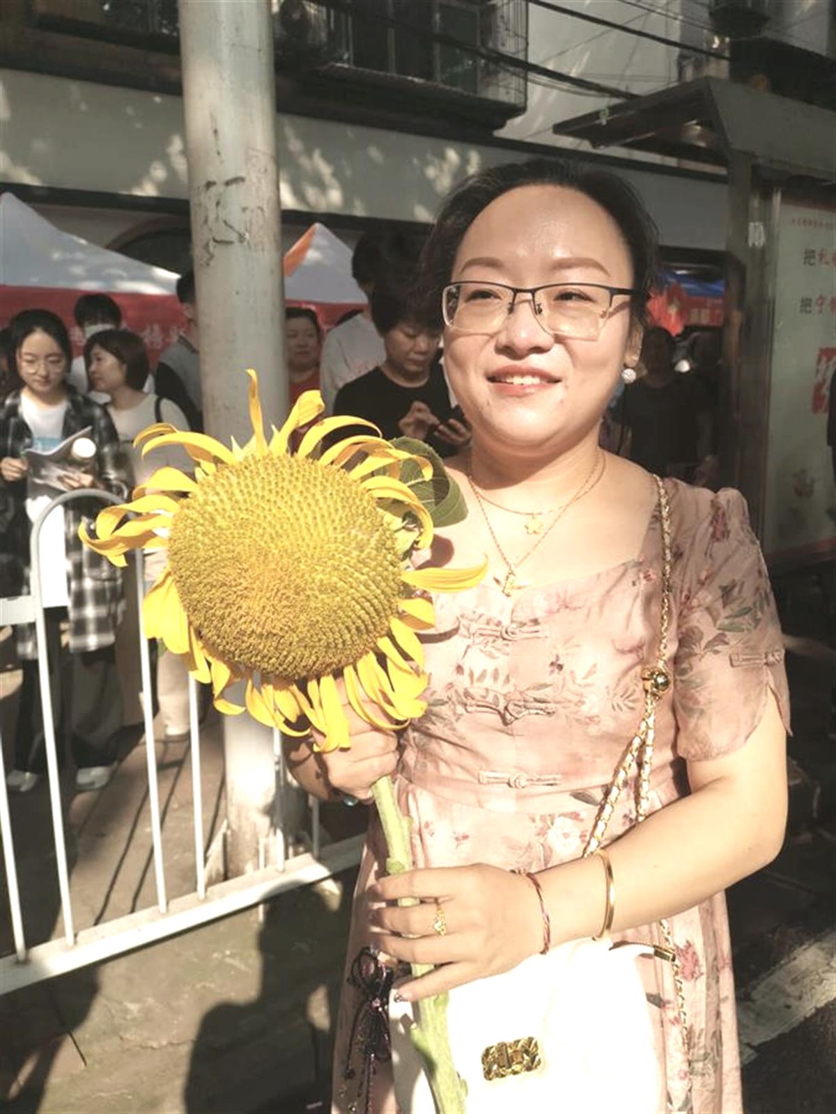 极目新闻记者看到,帅女士手上拿的一株向日葵,明显比其他家长买的观赏型向日葵要大两圈。原来,这是她亲手种植的,是食用型向日葵,“我的两个表弟今年参加高考,希望他们一举夺‘葵’,成功冲击985大学。”