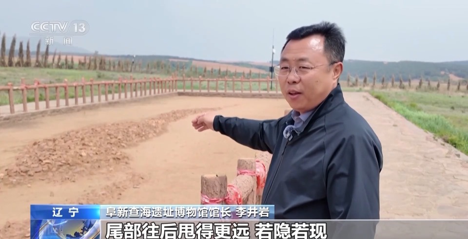 阜新查海遗址博物馆馆长 李井岩:这里就是龙头,背部弯弓往后甩去,尾部往后甩得更远,若隐若现,给人一种腾飞的态势,栩栩如生。