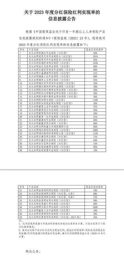 根据光大永明人寿官方网站的信披显示,2023年度光大永明人寿共公布39款分红保险产品的红利实现率。据统计,其中最高的为115%,来自光大永明鸿运相传终身寿险A款(分红型),33款分红保险产品的红利实现率未达100%,其中光大永明鑫玺人生年金保险(分红型)、光大永明金保鸿利两全保险(分红型)、光大永明金保安盈年金保险(分红型)的红利实现率低至19%。