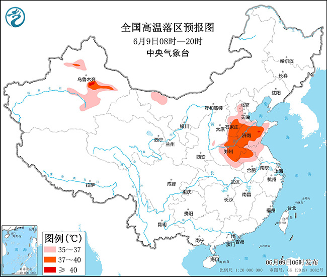 中央气象台9日继续发布高温黄色预警。预计6月9日白天,内蒙古西部、新疆沿天山地区和南疆盆地、河北中南部、北京、天津西部和南部、山东大部、河南大部、安徽北部、江苏北部等地有35℃至36℃高温天气,其中,新疆北疆沿天山地区和吐鲁番盆地、河北南部、山东中西部、河南中东部、安徽北部等地部分地区最高气温37℃至39℃,局地可达40℃以上。