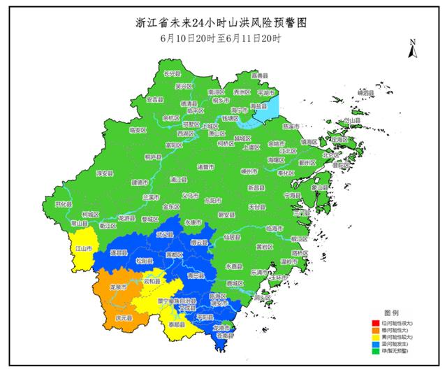 根据省气象台未来降雨预报,预计6月10日20时至6月11日20时,庆元县、龙泉市发生山洪灾害可能性大(橙色预警),泰顺县、江山市、云和县、景宁畲族自治县发生山洪灾害可能性较大(黄色预警),平阳县、苍南县、文成县、瑞安市、武义县、莲都区、青田县、缙云县、遂昌县、松阳县可能发生山洪灾害(蓝色预警)。