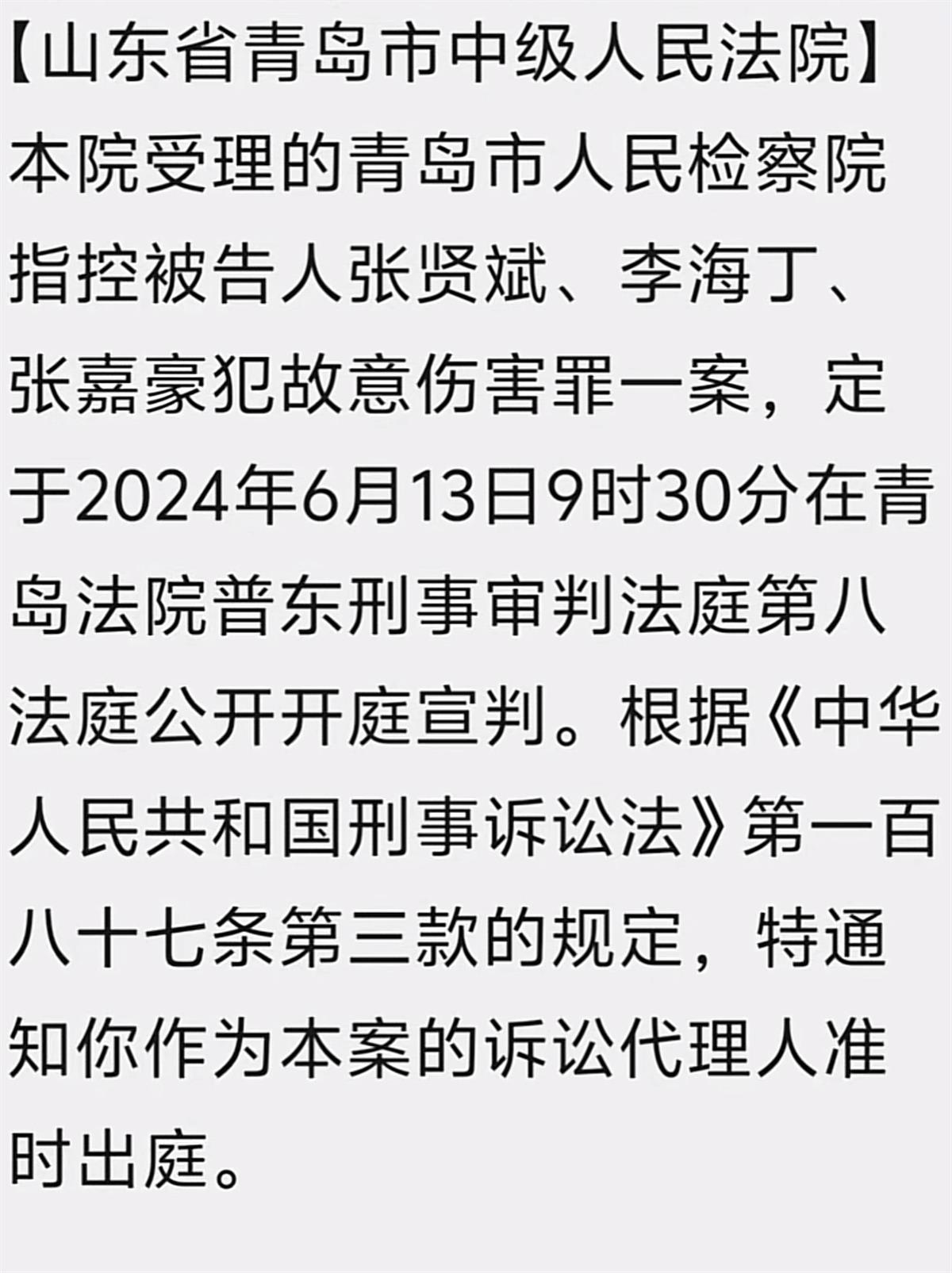 翟先生告诉记者,他于9日接到了青岛市中级人民法院发出的通知,称该院受理的青岛市人民检察院指控被告人张某斌、李某丁、张某豪犯故意伤害罪一案,定于6月13日9时30分在青岛法院普东刑事审判法庭第八法庭公开开庭宣判。