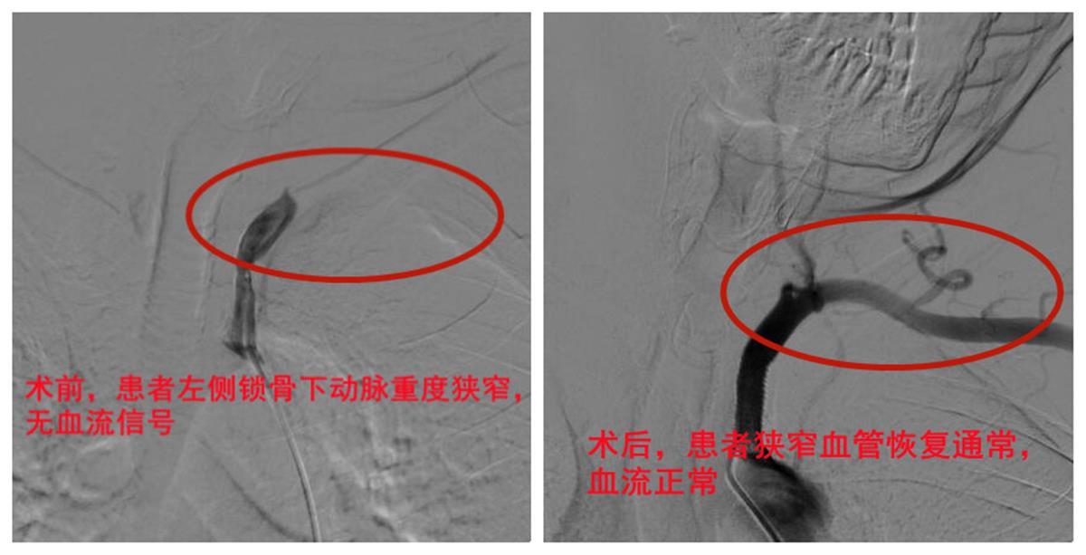 初步体检查体,接诊的心血管内科副主任医师余稳发现,邱先生精神极度萎靡,测量血压出现双侧血压值明显不对称的情况,一侧上肢脉搏明显减弱。结合病史及病程,余稳高度怀疑,正是由于邱先生锁骨下动脉某段狭窄,导致向同侧大脑和上肢供应的血流明显减少,这才出现双侧上肢血压不对称、头晕、肢体麻木、乏力等脑缺血症状。为避免病情进展引起大面积脑梗危及生命,余稳耐心解释并成功劝说邱先生及时完善了相关影像检查,最终确诊,他的左锁骨下动脉近段重度狭窄已达90%。