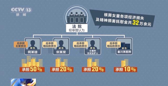 最终,法院核算女童各项经济损失及精神损害抚慰金共32万余元,判令由被告何某琼、被告宋某荣、原告女童的法定监护人以及被告富川某医院等责任主体,按照过错程度及与损害后果关联度,分别承担50%、20%、20%、10%的赔偿责任。