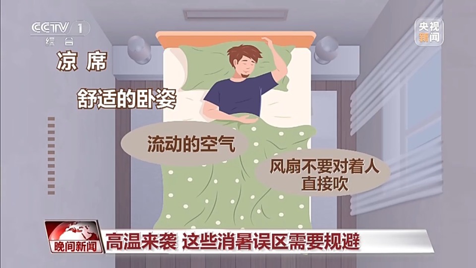 正确做法是:选择凉席加上舒适的卧姿,配合室内流动的空气,风扇不要对着人直接吹。
