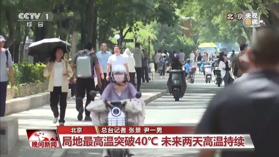 截至11日下午2点,北京市中心城区的最高气温已达35℃,全北京最高温出现在西部的门头沟区,达40.3℃。预计这样的高温天气还将持续到后天。阳光猛烈,热浪滚滚,路上行人纷纷戴上遮阳帽,打上遮阳伞,以躲避灼热的阳光。此外,气象部门还提醒,午后路面温度高,车辆爆胎风险增加,需做好防范。