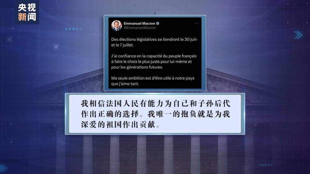 法国总统马克龙10日在社交媒体上再度就解散议会这一决定发声。他说:“我相信法国人民有能力为自己和子孙后代作出正确的选择。我唯一的抱负就是为我深爱的祖国作出贡献。”