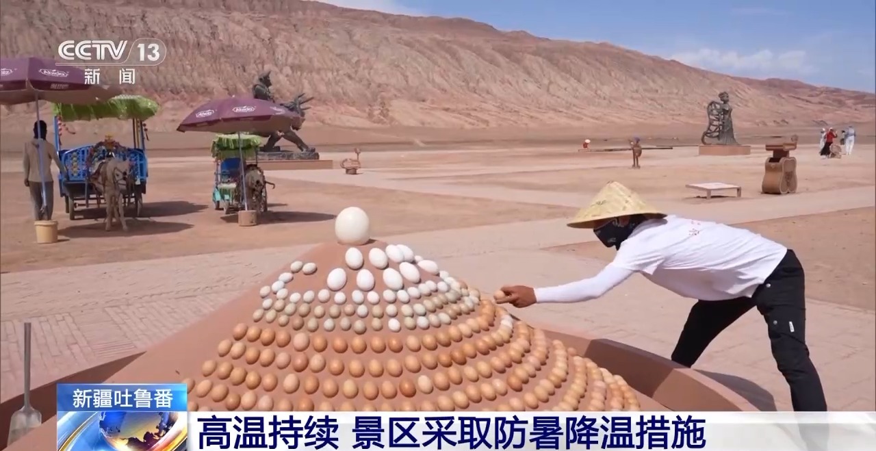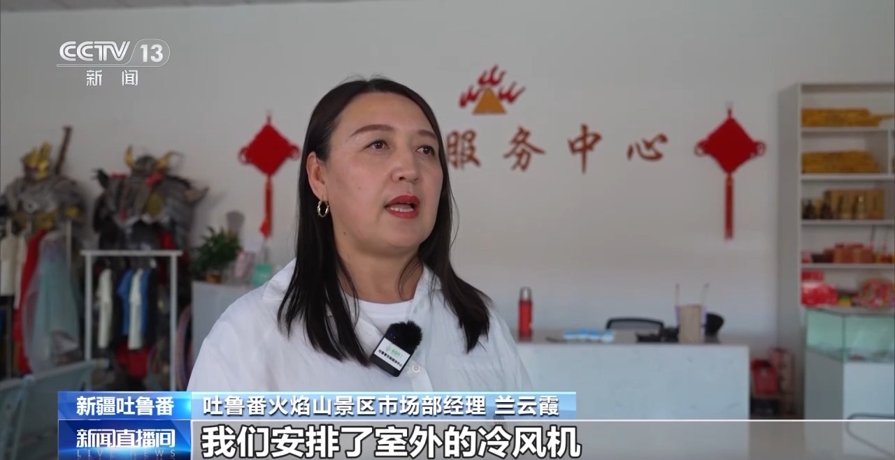 吐鲁番火焰山景区市场部经理 兰云霞:在一些高温区域,我们安排了室外冷风机,配备了冰袋。同时,我们还增配了些防暑药品,以应对游客可能出现的中暑情况。