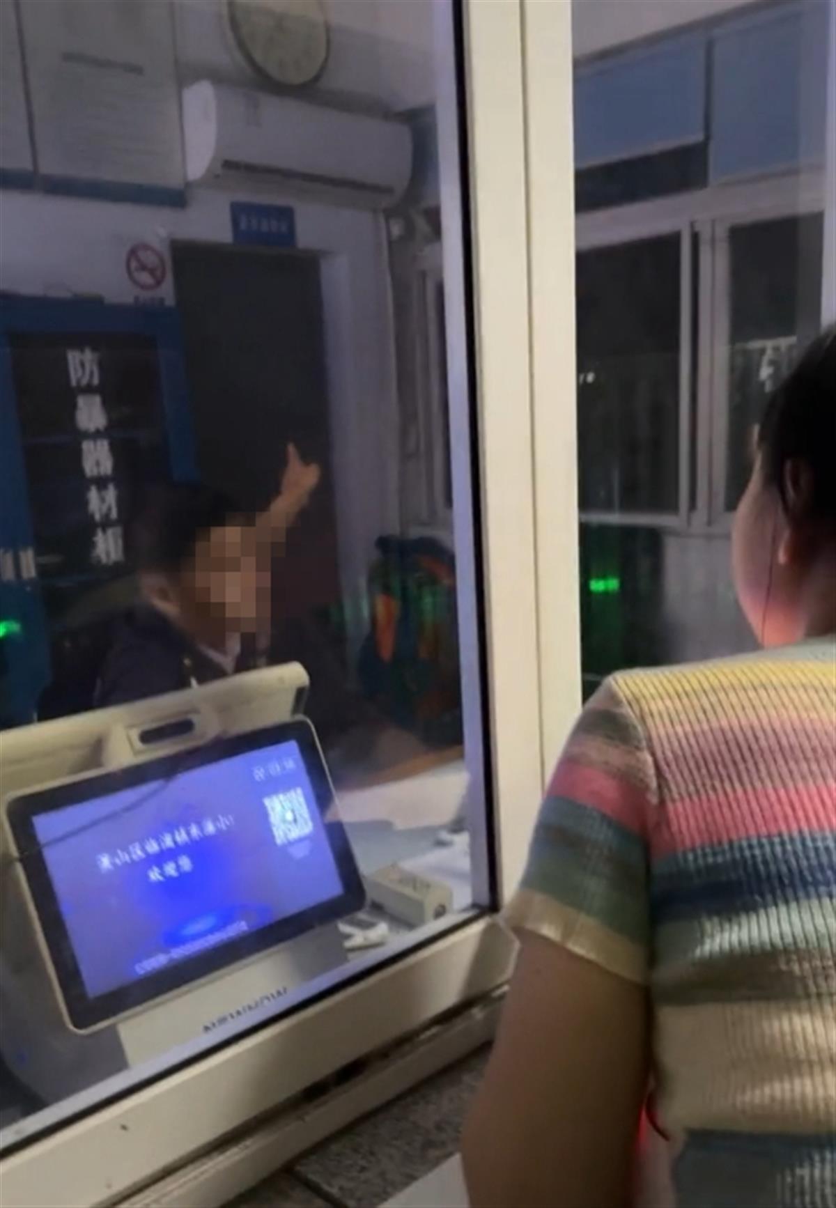 现场视频显示,在一保安室窗口,一名女子请求室内保安帮她开门,但保安以时间太晚为由拒绝开门。视频中的一个电子屏幕显示,事发地点为杭州市临浦镇东藩小学,时间为晚上10时许。