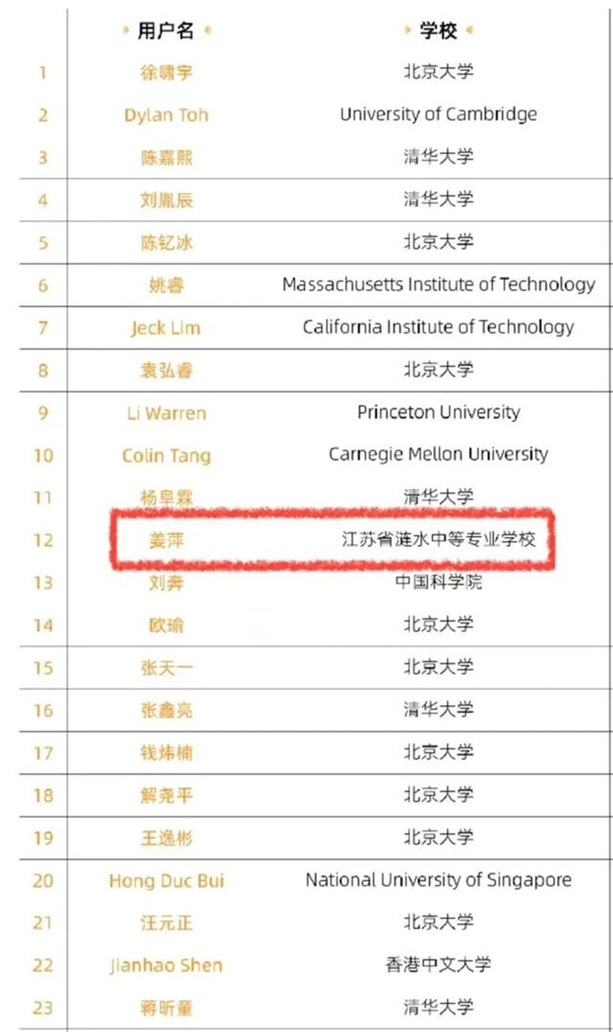 这位女生就是江苏省涟水中等专业学校的姜萍。她在预赛中从一众名校生中突围,拿到了93分的好成绩(入围分数线为45分),全球排名12,是阿里数赛举办以来首位打进决赛的中专在读生。