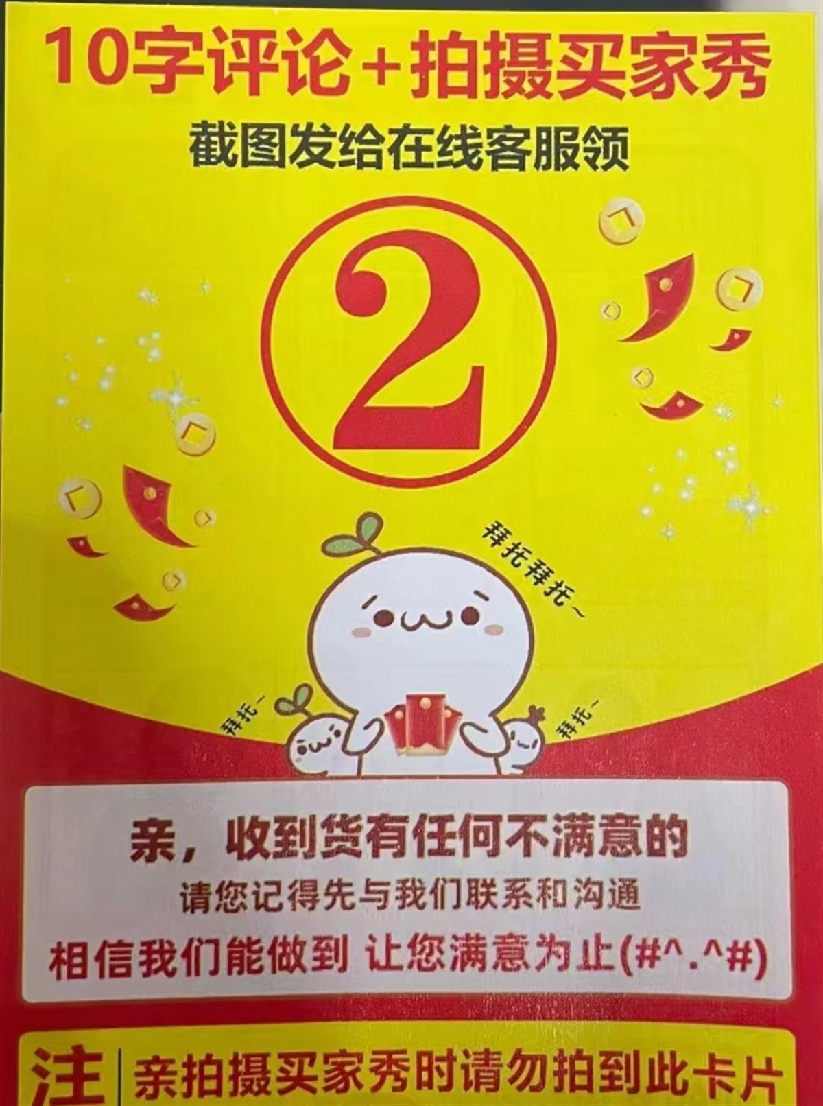 在某社交平台,一网友称自己在家点了份炸鸡外卖,同时收到了一张卡片。这张卡片不是此前的好评返现卡,而是一张买家秀卡片,上面写着“10字评论+拍摄买家秀,截图发给在线客服领2(元)”,还特别标注“拍摄买家秀时请勿拍到此卡片”字样。