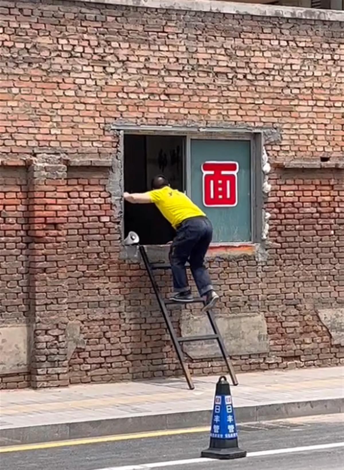 视频显示,一处红砖墙上开着一个推拉窗,一扇窗户上写着一个大大的“面”字。窗外一架矮梯倚墙而立,食客们有序爬梯、钻窗进店用餐,吃饱后再钻窗下梯离开。