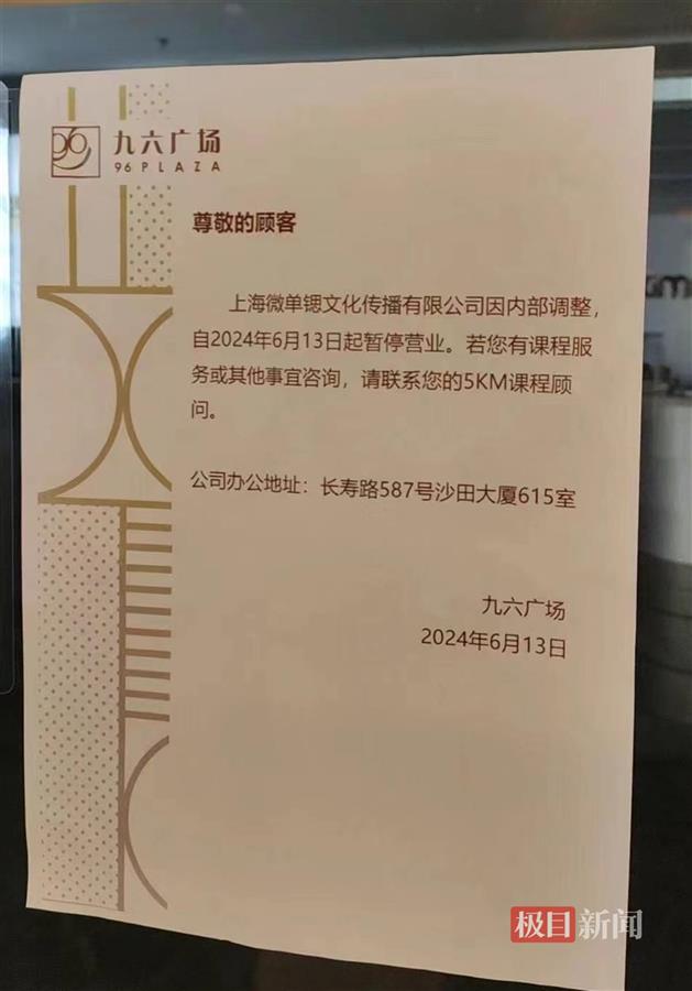 网友发给极目新闻记者的图片显示,6月13日,5KM上海九六广场店贴出了暂停营业的通知。该通知称,上海微单锶文化传播有限公司因内部调整,自2024年6月13日起暂停营业,若顾客有课程服务或其他事宜咨询,请联系课程顾问。极目新闻记者拨打该门店电话,一直无法接通。