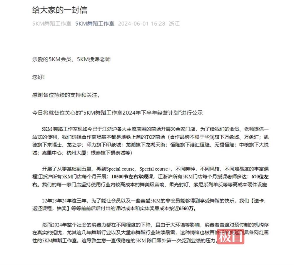 6月1日,5KM舞蹈工作室通过微信公众号推送文章《给大家的一封信》,信中称5KM在江浙沪各大主流商圈开设店面30余家,每月开展10500节左右常规课,每个月授课老师多达670人左右。2022年至2024年,付出课时成本和实体奖品成本6560万元。