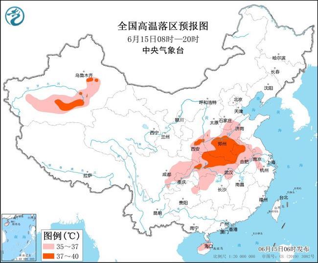 中央气象台6月15日06时继续发布高温黄色预警:预计6月15日白天,新疆南疆盆地、陕西中南部、山西南部、河北南部、山东西部、河南、安徽、江苏西部、湖北、湖南西北部、四川盆地、海南岛等地有35~36℃高温天气,其中,新疆南疆盆地、陕西中部、河南、安徽西北部、湖北北部、重庆东北部、海南岛西北部等地部分地区最高气温可达37~40℃。