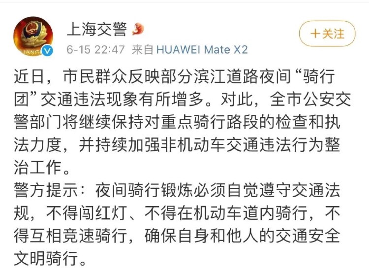 6月15日晚,上海交警表示,近日市民群众反映部分滨江道路夜间“骑行团”交通违法现象有所增多。对此,全市公安交警部门将继续保持对重点骑行路段的检查和执法力度,并持续加强非机动车交通违法行为整治工作。