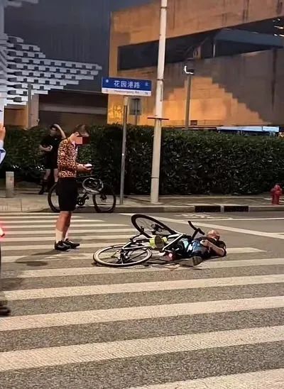 目击者回忆,当时,一名骑行者骑着单车经过苗江路近花园港路路口时,撞上了一名行人。照片显示,事故发生后,该行人倒在路口的人行横道线上,卧倒的自行车则压在当事人身上,情况一度比较危急。事故发生后,现场有协管人员到场。当事人受伤后,被及时送往附近医院观察治疗。
