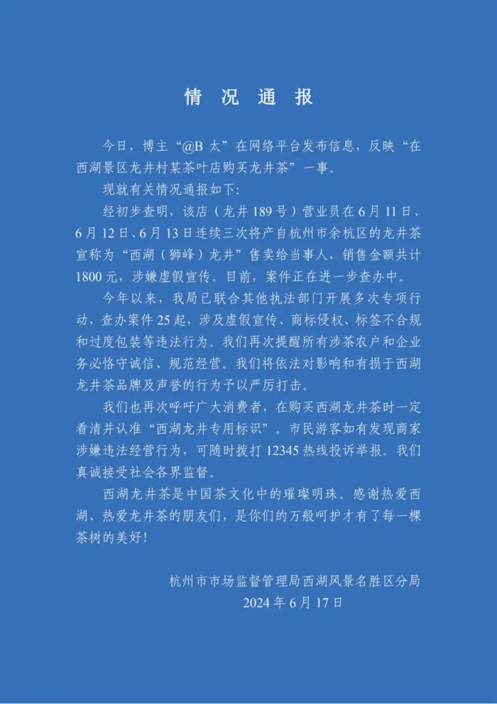 6月17日,杭州市市场监督管理局西湖风景名胜区分局就博主“@B太”在网络平台发布信息,反映“在西湖景区龙井村某茶叶店购买龙井茶”一事发布情况通报。经初步查明,该店(龙井189号)营业员在6月11日、6月12日、6月13日连续三次将产自杭州市余杭区的龙井茶宣称为“西湖(狮峰)龙井”售卖给当事人,销售金额共计1800元,涉嫌虚假宣传。目前,案件正在进一步查办中。