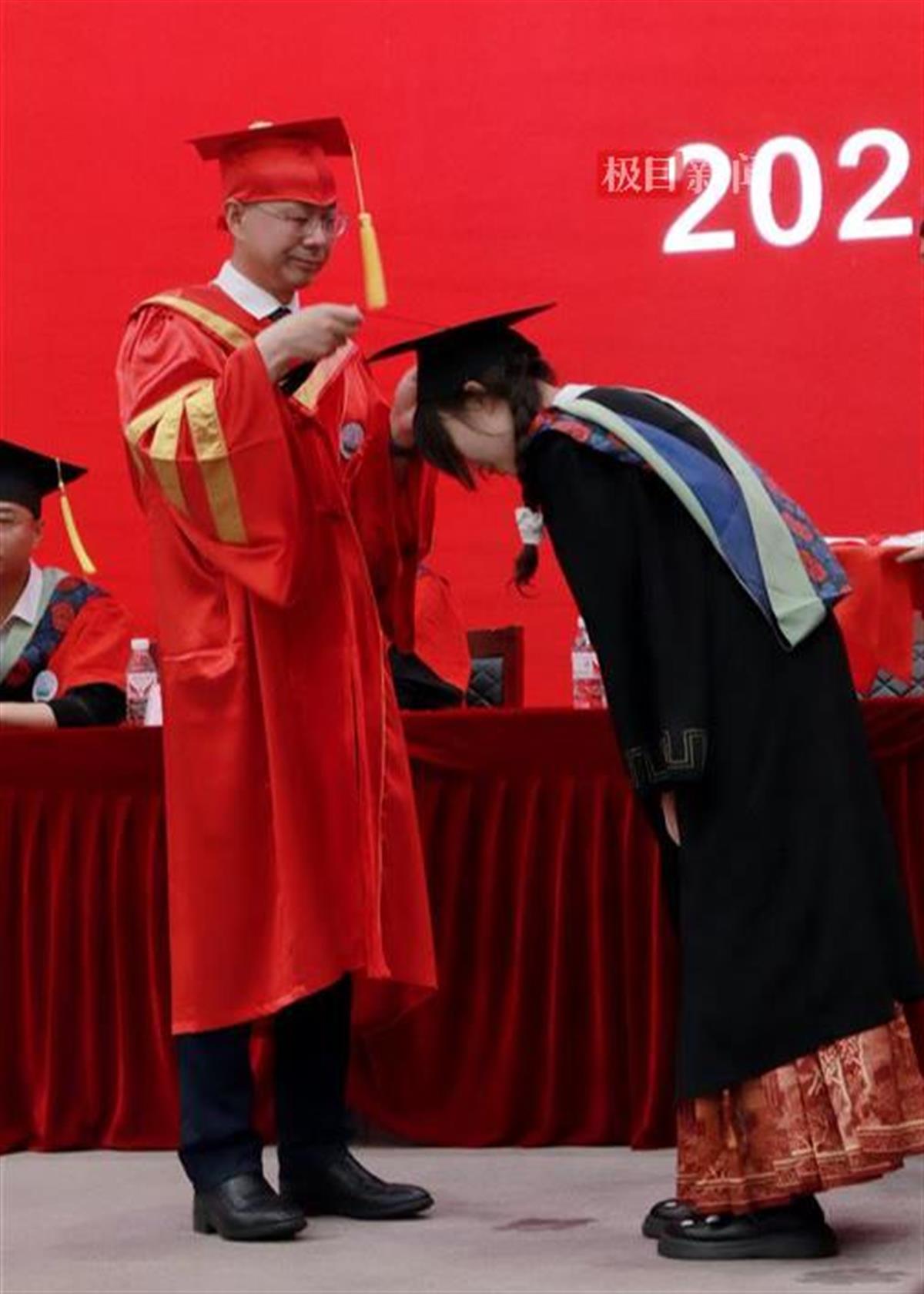 为了应对天气变化,该校还专门开设了多个室内分会场,举行隆重而又温馨的学位授予仪式。校领导和校学术委员会分赴各个分会场,为毕业生拨穗正冠颁发毕业证。