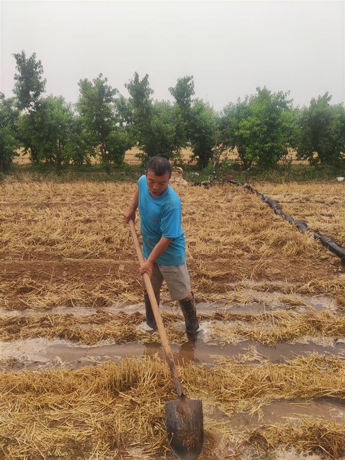 6月16日下午2时,邯郸市邯山区河沙镇西堤西堡村,刚下过阵雨的天气颇为凉爽,村民郭师傅正在地里抽井水浇地。他用铁锹清理田间的麦桩,让地里形成一道道小沟,以便水流能顺利流到更远的地方。