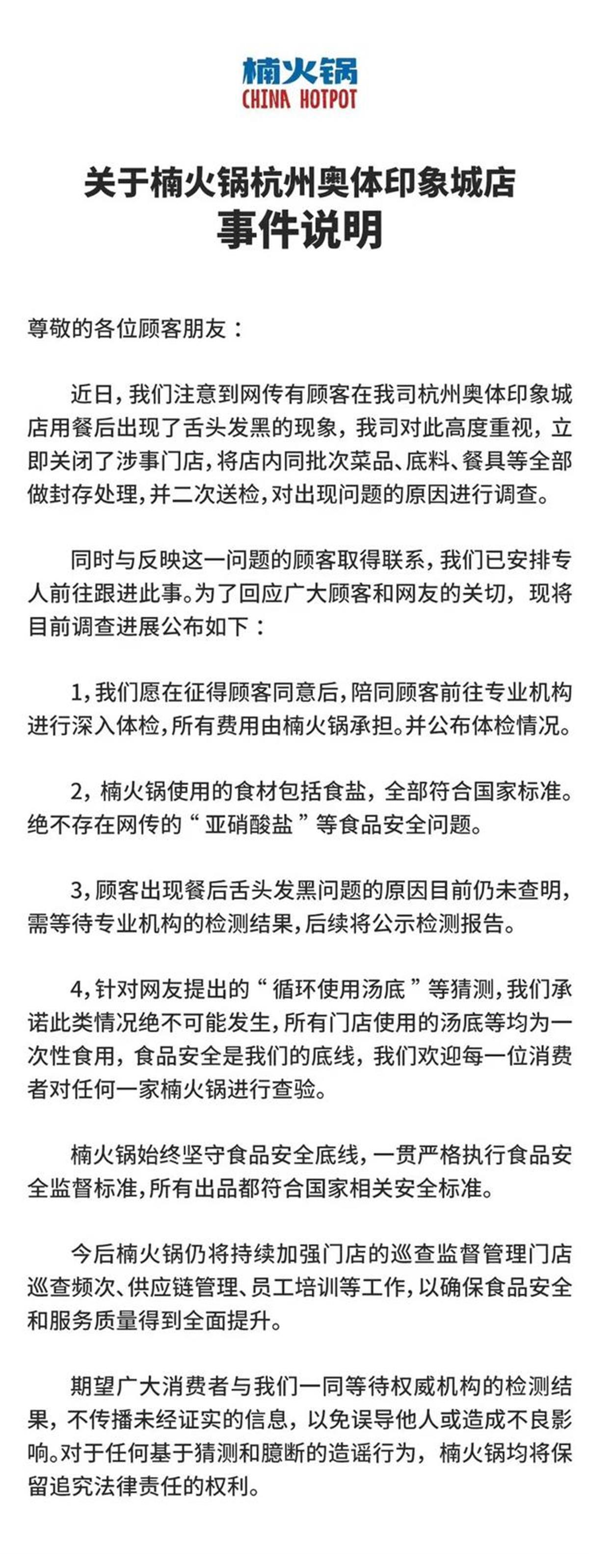 6月17日,楠火锅在微博发布相关说明称,针对网传有顾客在楠火锅杭州奥体印象城店用餐后出现了舌头发黑的情况,公司立即关闭了涉事门店,将店内同批次菜品、底料、餐具等全部做封存处理,并二次送检,对出现问题的原因进行调查。同时,公司与反映这一问题的顾客取得联系,已安排专人前往跟进此事。