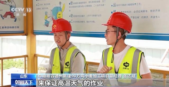 中粮粮谷德州新建90万吨小麦加工项目副经理 张志斌:严格控制户外作业时长,作业避开中午高温时段,我们还在现场设立了茶水间和休息室,来保障高温天气的作业。