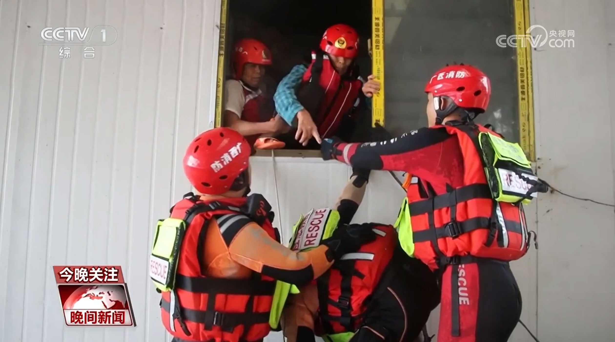 在兴安县溶江镇塔塘村,两位老人被洪水困在家中,房屋一层已经被洪水淹没,消防救援人员只能利用橡皮艇不断摸索前进,再利用身体搭建好“人梯”将被困群众从窗户转移。