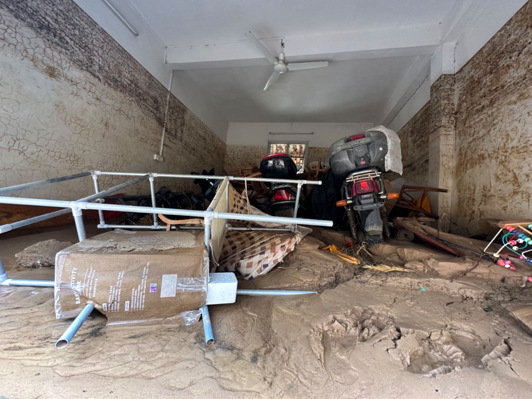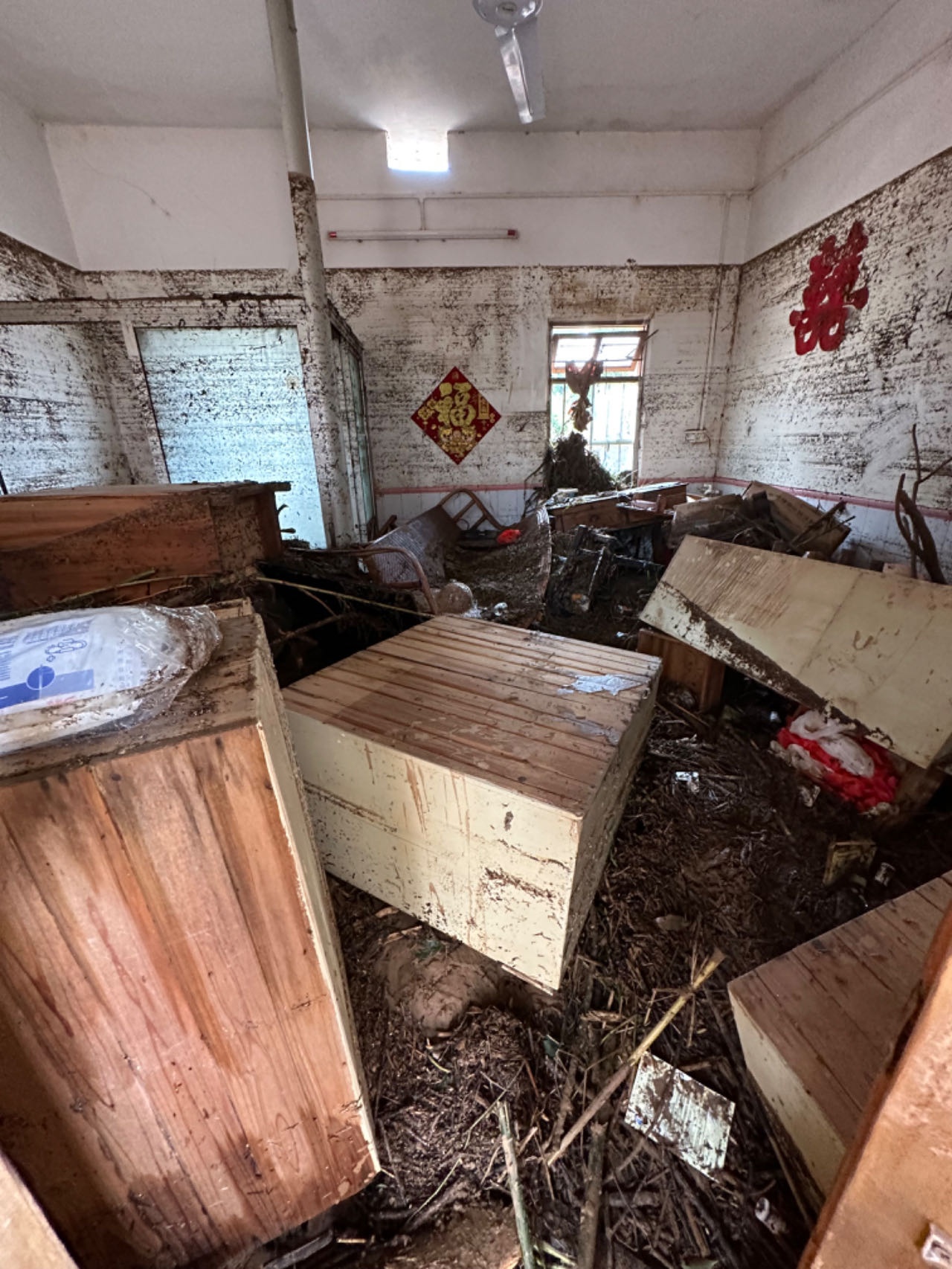 王乐家开设的便民药店遭受洪水重创,“10万损失肯定是有的”。洪水退去,他的家里遍地淤泥,木质家具泡水倒落,满目狼藉。