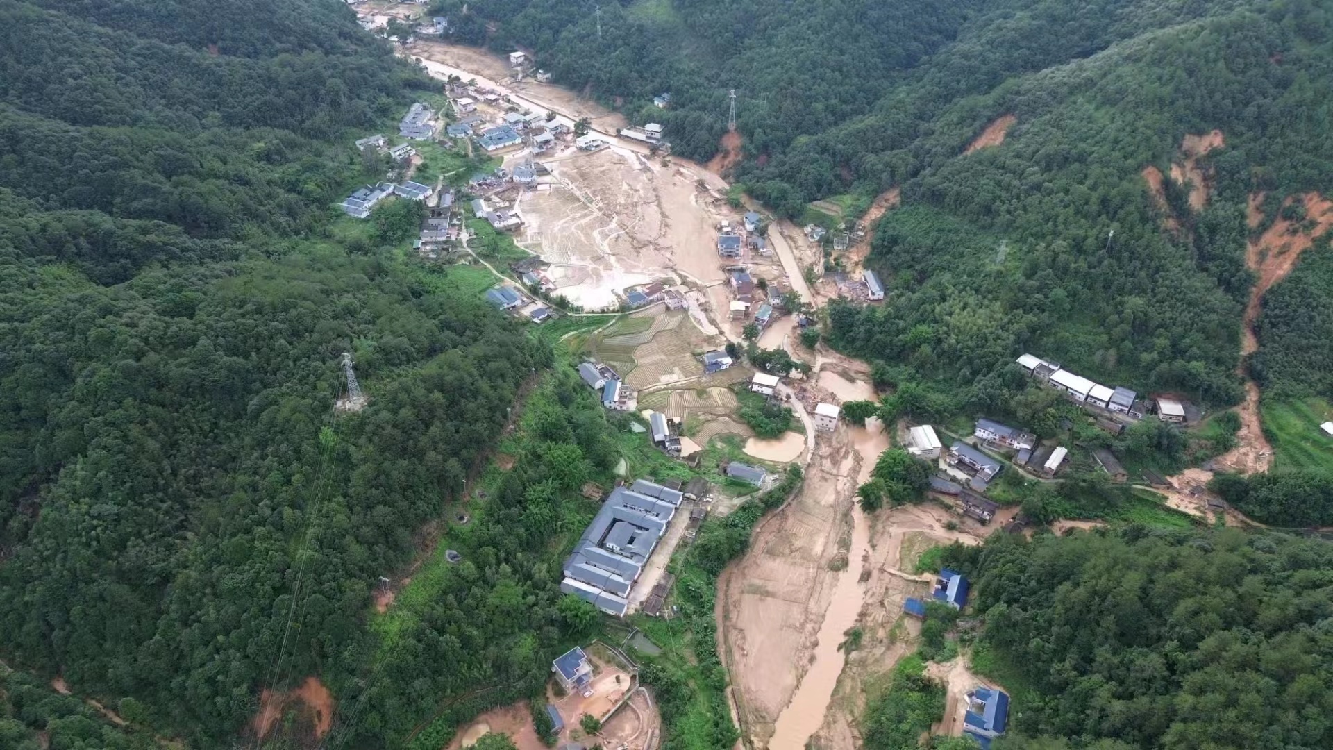 肩峰下村地处粤闽赣三省交界处。群山环抱之中,一条小小的差干河流经村庄。河对面便是福建。受强降水云系影响,差干河上游的竹岭发电站被洪水冲溃。