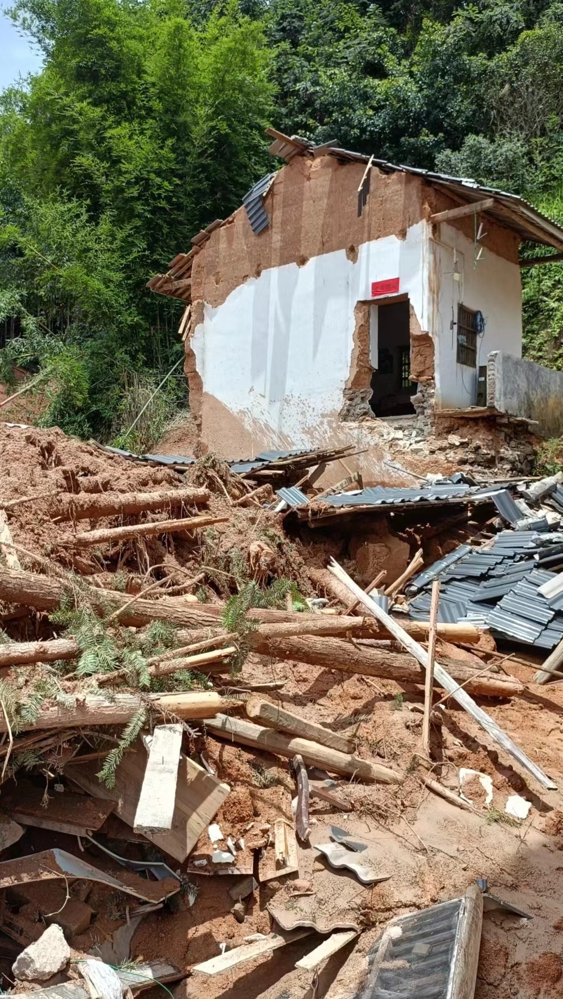 19日,王志坚改道福建,翻山越岭,过桥渡河,用时3个多小时,终于抵达位于山脚的村庄。村里倒塌、受损房屋过半。王志坚家的红砖房也被洪水冲垮了。