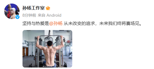 6月20日下午,孙杨工作室发布消息称:“坚持与热爱是孙杨从未改变的追求,未来我们终将赛场见。”
