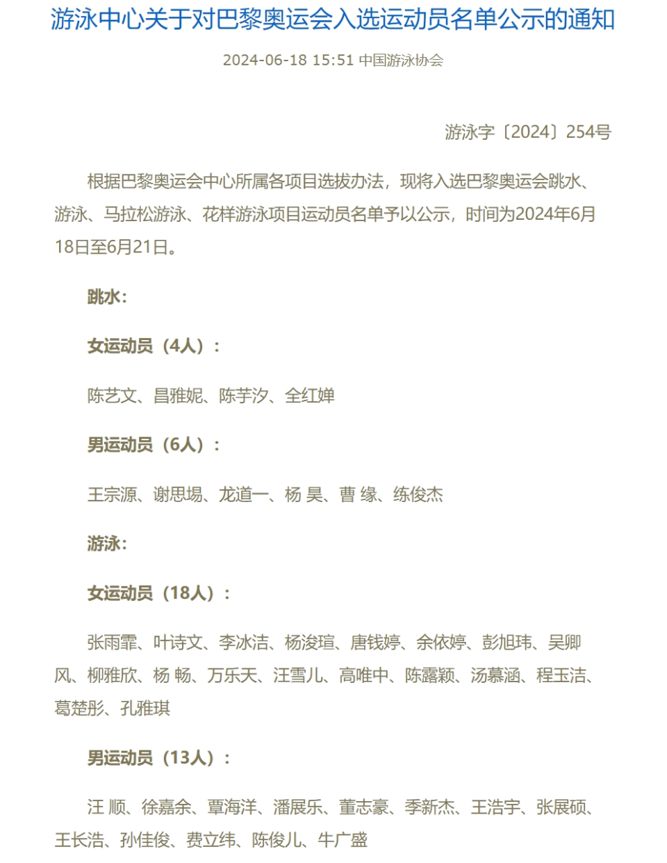 6月18日,国家体育总局游泳中心公示入选巴黎奥运会跳水、游泳、马拉松游泳、花样游泳项目运动员名单,32岁的孙杨落选,正式无缘巴黎奥运正赛,今日,相关话题冲上热搜。