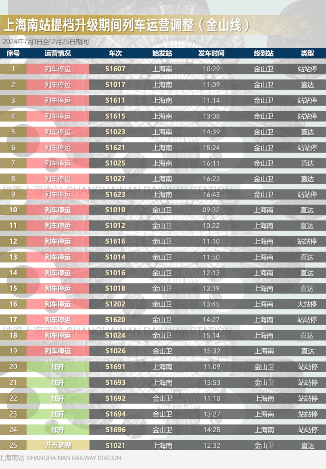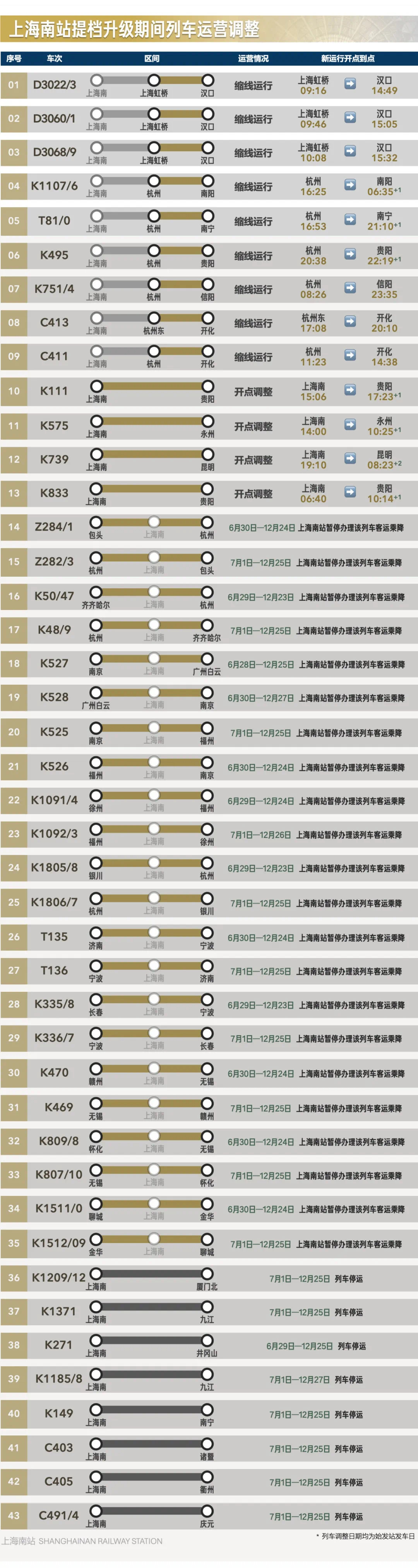 记者从铁路上海站获悉,2024年7月1日起,上海南站设施更新改造工程将正式启动,因上海南站改造施工,其间部分旅客列车临时停运。详见↓