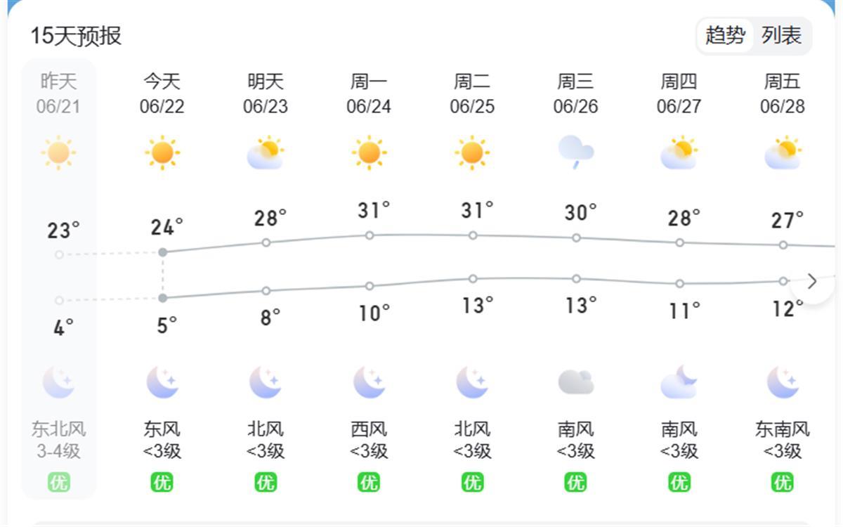 记者查询发现,在黑龙江大兴安岭塔河县,连续数日的最低气温都不足10℃。21日最低气温只有4℃,最高气温为23℃。22日最低气温只有5℃,最高气温为24℃。
